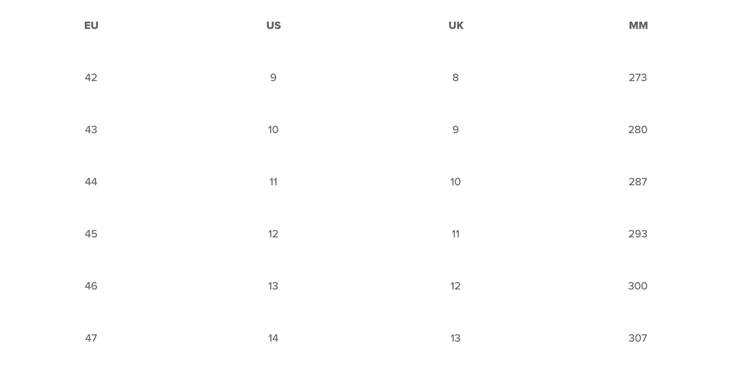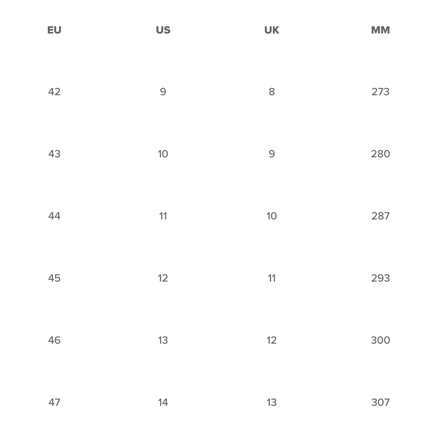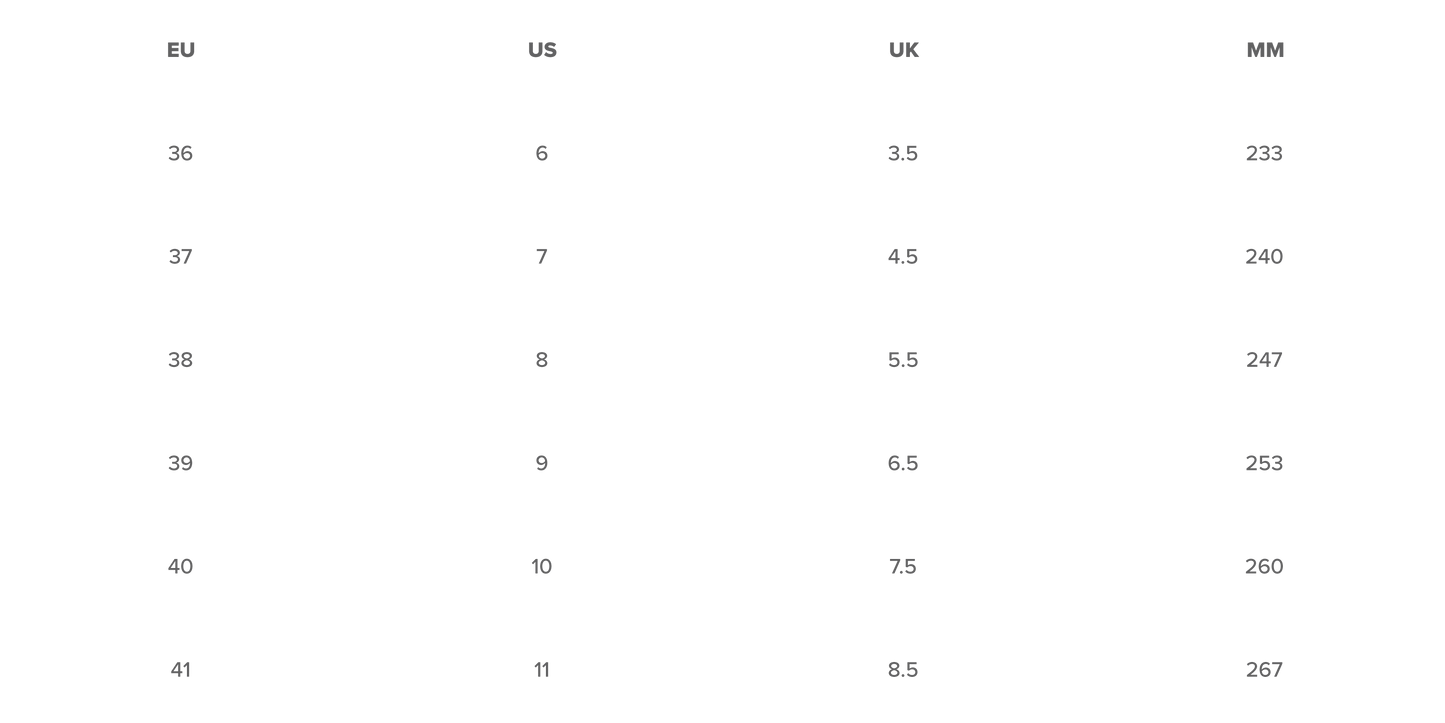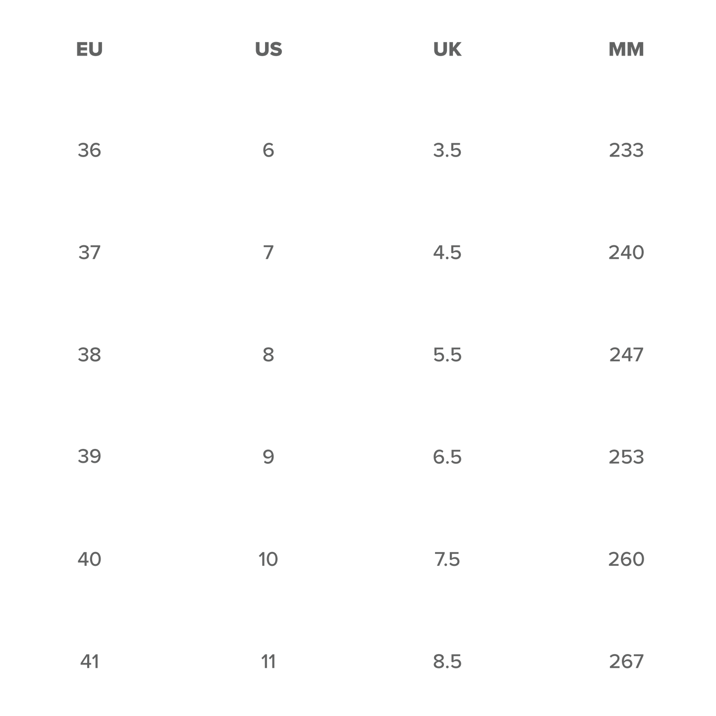 All our styles fit true to size, adhering to a standard (medium) width. As sizing can vary between different brands, we recommend comparing the MM length on the sizing chart below with your foot measurement from heel to end of big toe to get an accurate fit (NB this is the internal length).