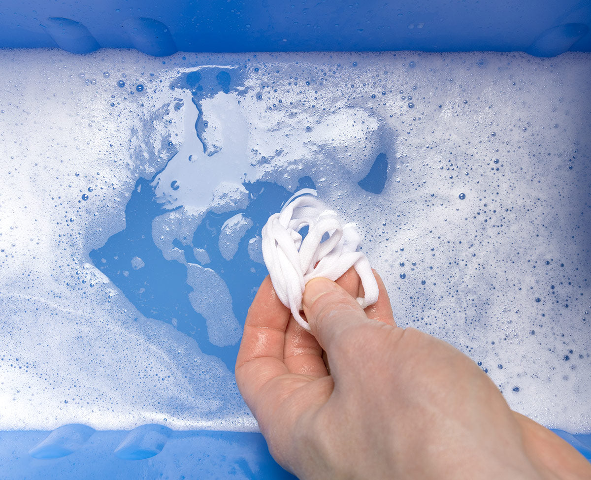 Using a gentle detergent (we recommend Ecostore in New Zealand & Australia), prepare a bucket or sink with lukewarm water, making sure to get it nice and foamy.