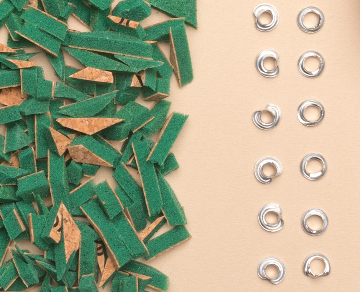 Aluminum eyelets are stripped from the uppers and reintroduced to the local recycling system.
