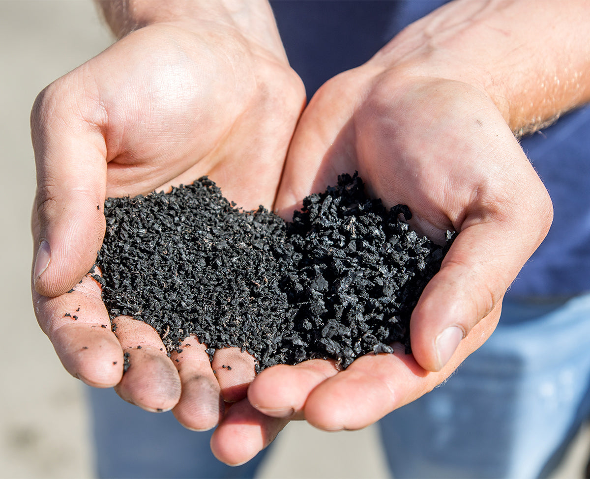 Separated from their uppers, the natural rubber soles and upper reinforcements (used in the heel & toe) are ground into rubber crumb alongside end-of-life tyres and then repurposed into roading asphalt, equestrian arenas and artificial sports turf.